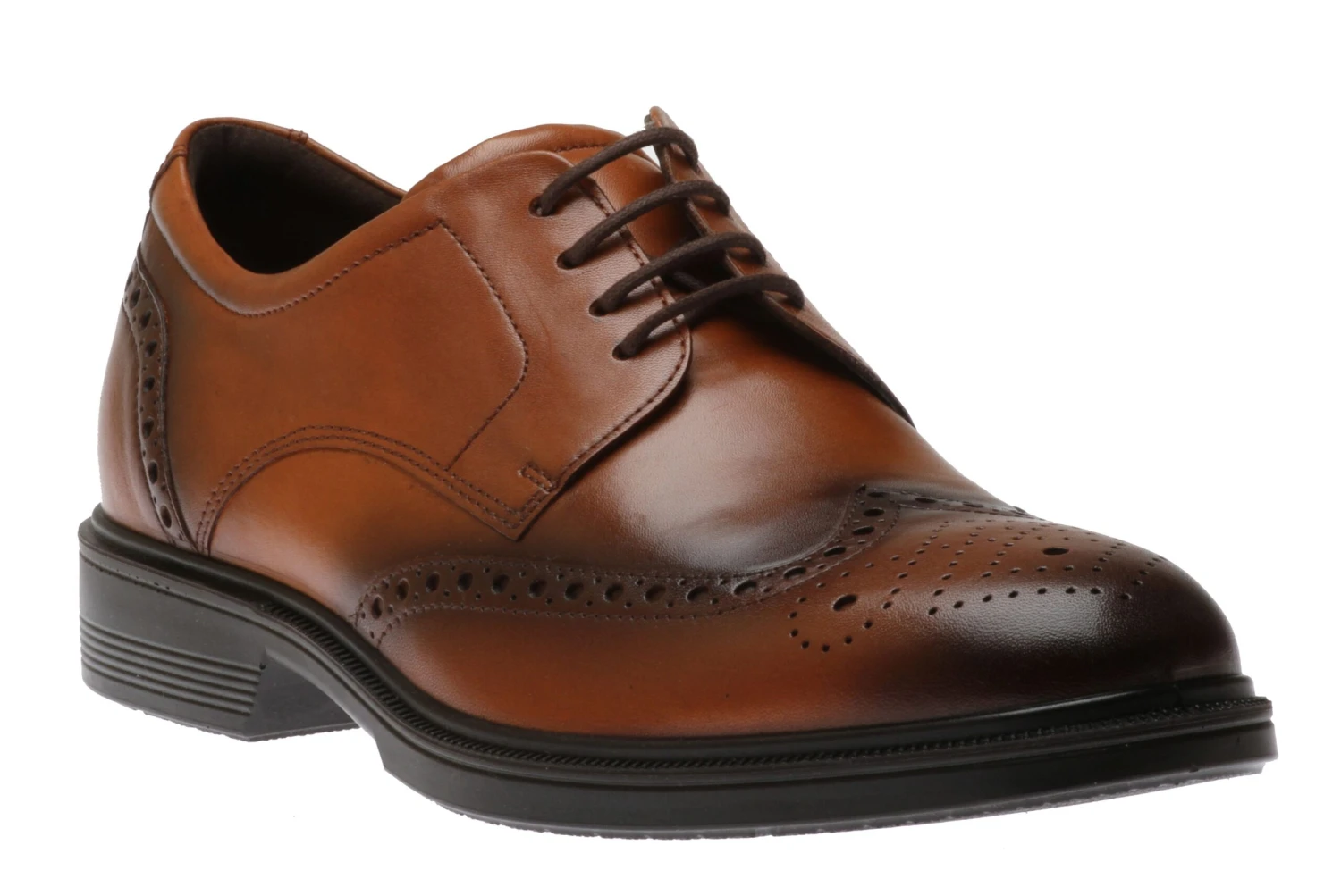 This classic Lisbon brogue dress shoe is crafted from full-grain leather and features adjustable laces for a secure comfortable fit. Inside, a removable leather-covered inlay sole is enhanced with the Ecco Comfort Fibre Systemâ„¢, which circulates air to keep feet fresh and dry. A tough but lightweight direct-injected polyurethane outsole provides secure comfortable traction.